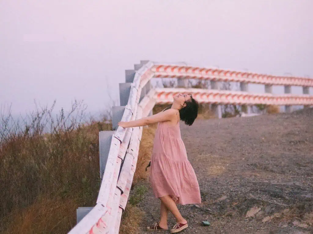 Con đường sỏi đá dẫn bạn đến đỉnh đồi có phần khó đi, ngoằn nghèo, nhưng chính sự hoang sơ ấy lại tạo ra không gian vô cùng thơ mộng. Đồi cỏ khô có những dải phân cách trắng – đỏ, tuy đơn giản nhưng lại trở thành background hoàn hảo cho những tấm hình triệu tim. Bạn có thể thoải mái thả dáng để tạo nên những shoot hình chất lừ. Đặc biệt, nếu đến đây đúng vào lúc hoàng hôn, ánh chiều tà sẽ bao phủ lên mọi thứ một màu sắc lãng mạn, huyền bí, khiến mỗi bức ảnh đều trở nên thật tuyệt vời.