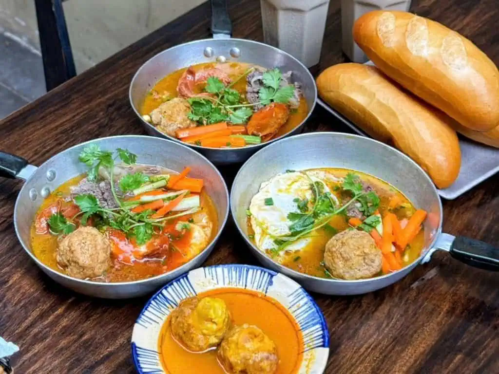 Bánh mì Hàng Quyên là một trong những địa chỉ bán bánh mì chảo nổi tiếng ở Vũng Tàu, thu hút đông đảo thực khách bởi hương vị đặc trưng. Bánh mì ở đây giòn rụm, ăn kèm chảo topping đầy đặn gồm pate, trứng ốp la, chả lụa, xúc xích, thịt xíu mại cùng nước sốt đậm đà, tạo nên một bữa ăn hấp dẫn.