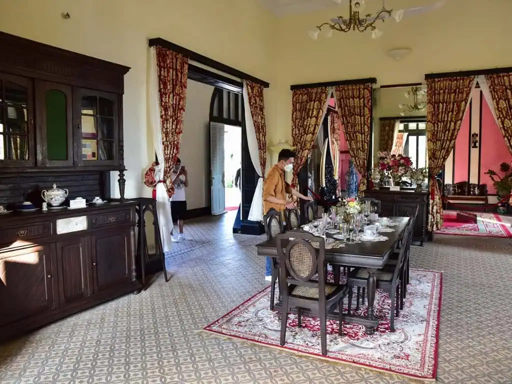 Bước vào không gian bên trong, du khách sẽ được chiêm ngưỡng những hiện vật cổ có giá trị lịch sử hơn trăm năm, vẫn được gìn giữ nguyên vẹn qua thời gian. Những bộ bàn ghế gỗ sang trọng, sáng bóng với hoa văn điêu khắc tinh xảo, cùng bộ tam đa Phúc – Lộc – Thọ thể hiện phong cách vương giả, đậm nét nghệ thuật. Ngoài ra, nơi đây còn sở hữu cặp ngà voi Châu Phi, hai chiếc bình Bách Điểu Chầu Phụng quý hiếm, tượng trưng cho sự quyền uy và phú quý.