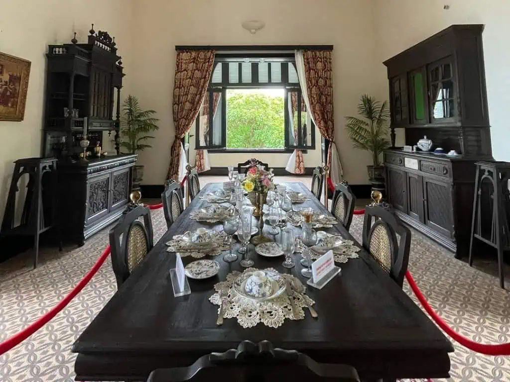 Bên cạnh dinh thự chính, khuôn viên rộng lớn được bao bọc bởi hàng cây giá tỵ xanh mát và cây sứ cổ thụ trăm năm tuổi, tạo nên một không gian thiên nhiên hài hòa và tràn đầy sức sống. Những bậc thang đá rêu phong tinh tế dẫn lối du khách qua từng góc khu vườn, mở ra những khung cảnh mới mẻ, nơi từng chứng kiến nhiều sự kiện lịch sử quan trọng.