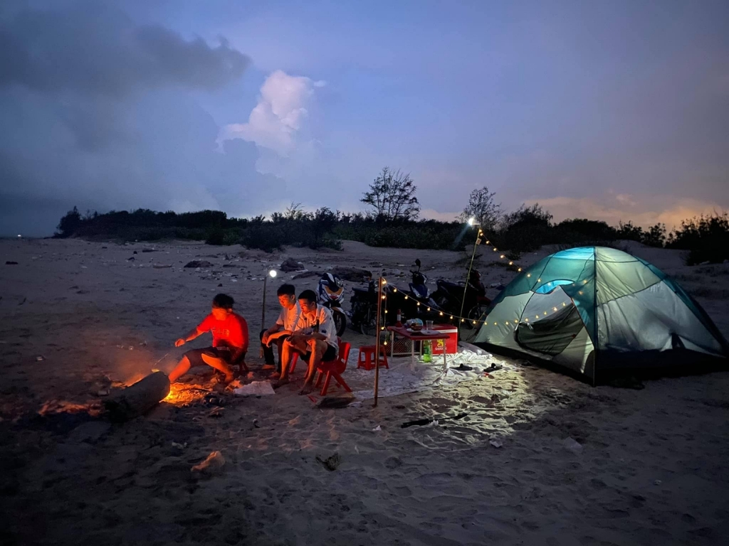 Phía trên bãi biển là khu rừng dương rộng lớn, lý tưởng để dựng lều, cắm trại và tổ chức tiệc BBQ bên bạn bè, gia đình. Khi màn đêm buông xuống, ánh lửa trại bập bùng, hương thơm của món nướng hòa quyện cùng tiếng sóng biển tạo nên không gian ấm cúng, lãng mạn. Bạn còn có thể ngắm bầu trời đêm đầy sao lung linh – trải nghiệm thiên nhiên hiếm có, không thể tìm thấy ở các thành phố đông đúc, xô bồ.