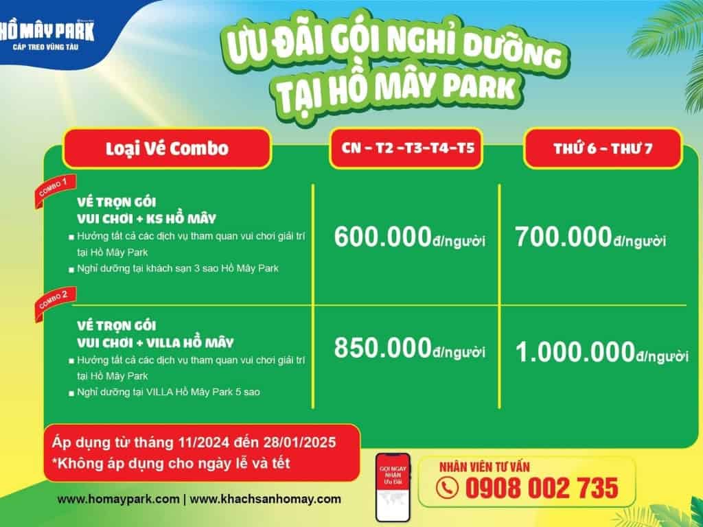 Lưu ý rằng vé cáp treo Vũng Tàu trọn gói không bao gồm chi phí khách sạn, ăn uống, tour xe điện, tham quan nông trại và trận địa pháo cổ. Nếu bạn có thêm kế hoạch cắm trại qua đêm hoặc tổ chức sự kiện tại Hồ Mây, hãy tham khảo thông tin bảng giá sau:
