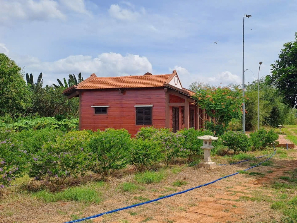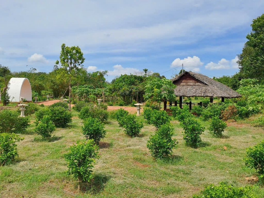 Khu vực xung quanh có cánh đồng lúa xanh và vườn cây ăn trái tạo không gian yên bình, giúp du khách thư giãn sau hành trình khám phá lịch sử.