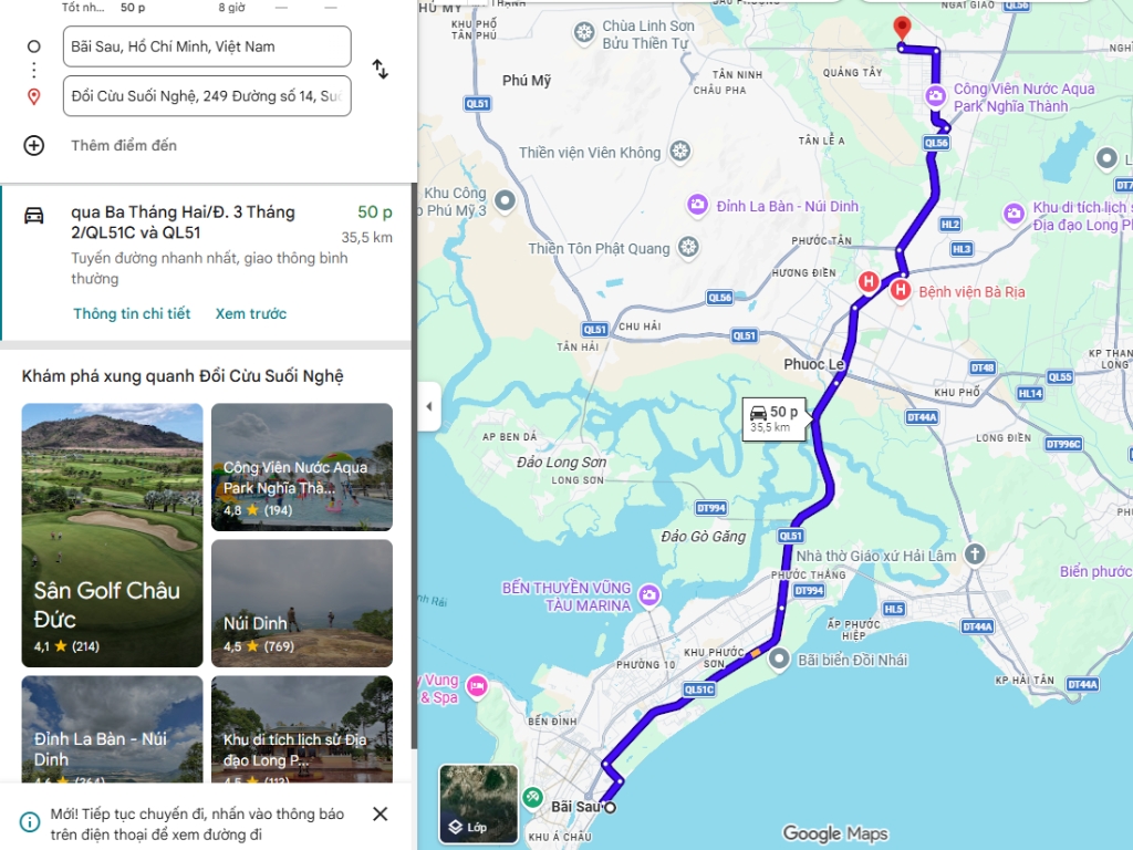 Quãng đường từ Vũng Tàu đến đồi cừu Suối Nghệ khoảng 30–40km, thời gian di chuyển khoảng 45–60 phút. Bạn có thể đi xe máy, ô tô hoặc taxi để thuận tiện tham quan kết hợp các địa điểm gần đó như Hồ Đá Xanh, suối nước nóng Bình Châu hoặc các bãi biển Vũng Tàu trong cùng một lịch trình.