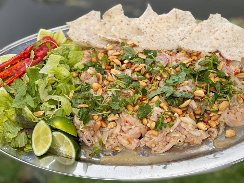 Đây là món ăn đặc sản nức tiếng ở Côn Đảo, được chế biến từ cá mập tươi kết hợp với chuối chát, khế, dứa và các loại rau mùi. Món gỏi này có hương vị đặc biệt, với sự hòa quyện giữa vị cay của ớt, chua của dứa và khế, cùng chút đắng nhẹ của chuối xanh, mang lại một trải nghiệm ẩm thực khó quên.