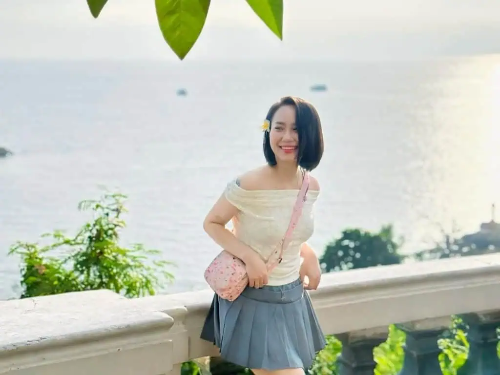 Chọn góc vườn hoa sứ hoặc ban công tháp lúc hoàng hôn (16h-18h) với hậu cảnh Bãi Trước, dùng góc rộng drone nếu có để capture toàn cảnh 360 độ. Tránh nắng trưa và mang filter ND cho ánh sáng vàng lý tưởng.