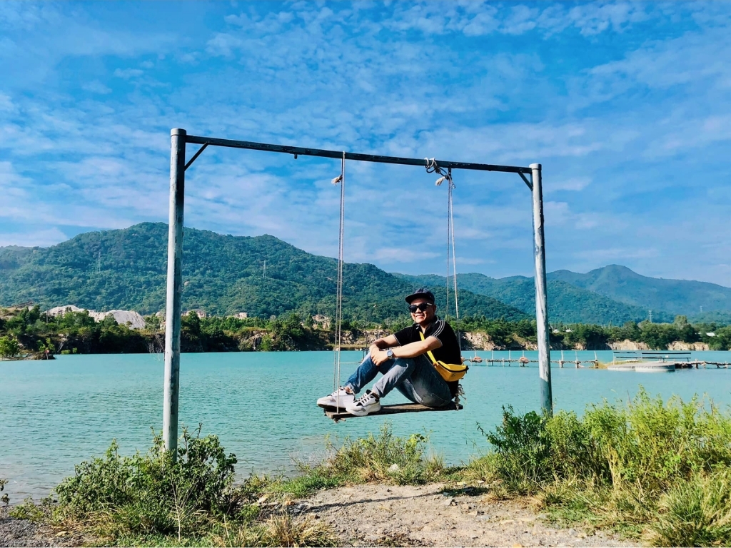 Bên bờ hồ, chiếc xích đu gỗ giản dị đặt giữa không gian trời đất bao la, mặt hồ tĩnh lặng và núi non trùng điệp tạo nên phông nền cực “deep”. Đây là nơi du khách yêu thích để chụp hình và thư giãn nhẹ nhàng.