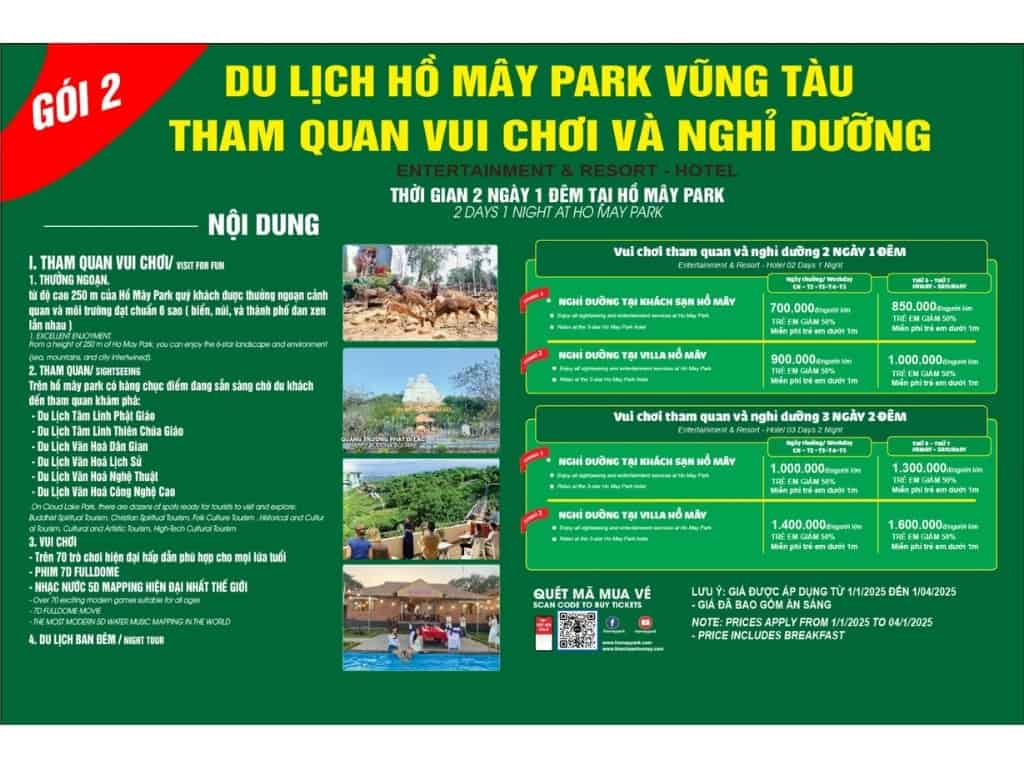 | Tour tham quan Hồ Mây Park | 100.000 VNĐ | 50.000 VNĐ | Miễn phí |