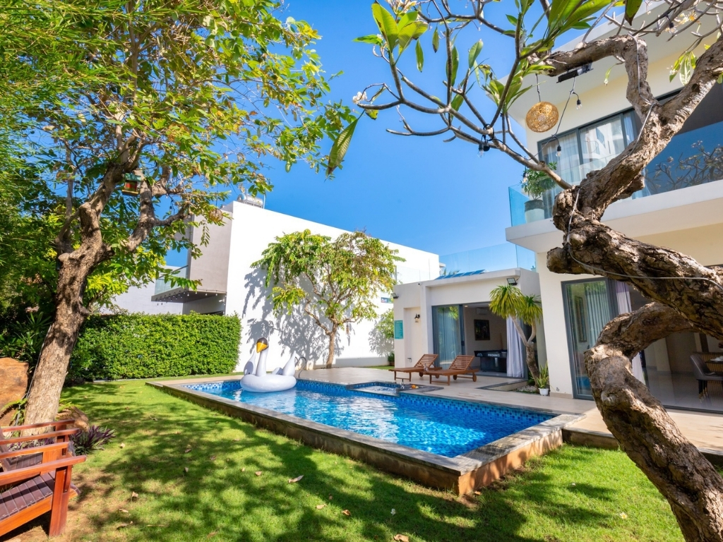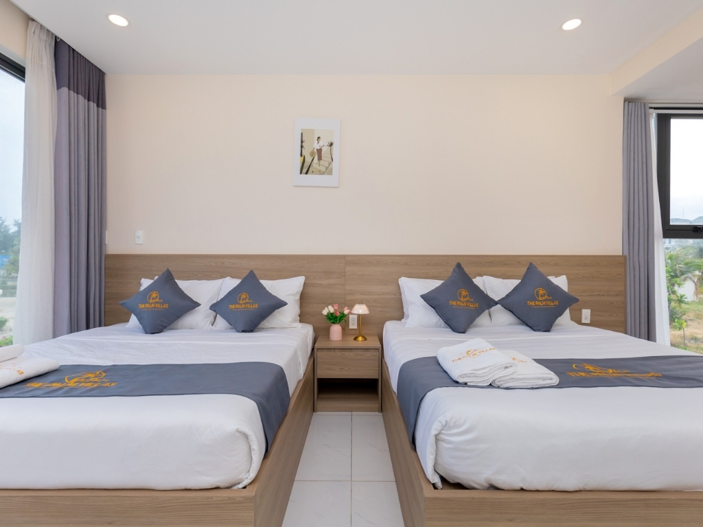 Với diện tích khoảng 35m², phòng đôi 4 người lý tưởng cho nhóm bạn hoặc gia đình 4 người. Phòng bố trí 2 giường đôi, nội thất tối giản nhưng tinh tế, có ban công rộng nhìn ra hồ bơi hoặc vườn cây. Trang thiết bị gồm máy lạnh, TV, tủ lạnh, két an toàn, bàn làm việc và phòng tắm riêng.