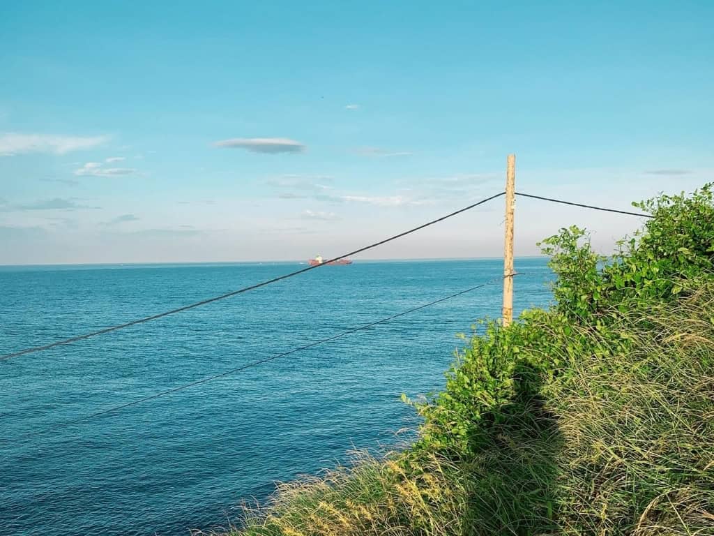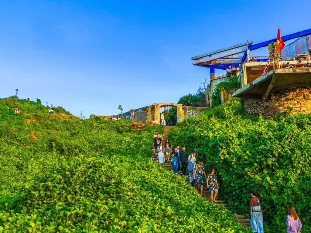 Nếu bạn muốn tìm hiểu thêm về vẻ đẹp tự nhiên của bãi Mũi Nghinh Phong, đừng bỏ qua con đường bậc thang dẫn lên Cổng Trời nhé. Con đường độc đáo này được bao quanh bởi những bụi cây thấp và cây cối xanh mướt, cùng với sự xuất hiện của một cây lớn đừng cô độc giữa cánh đồng cỏ. Tất cả những điều này đã tạo nên một bức tranh thiên nhiên đầy ấn tượng. Khi bước hết các bậc thang, bạn sẽ được chiêm ngưỡng khung cảnh Cổng Trời – nơi này như một thiên đường trên mặt đất, nơi bạn có thể ngắm nhìn toàn cảnh biển và núi xung quanh.