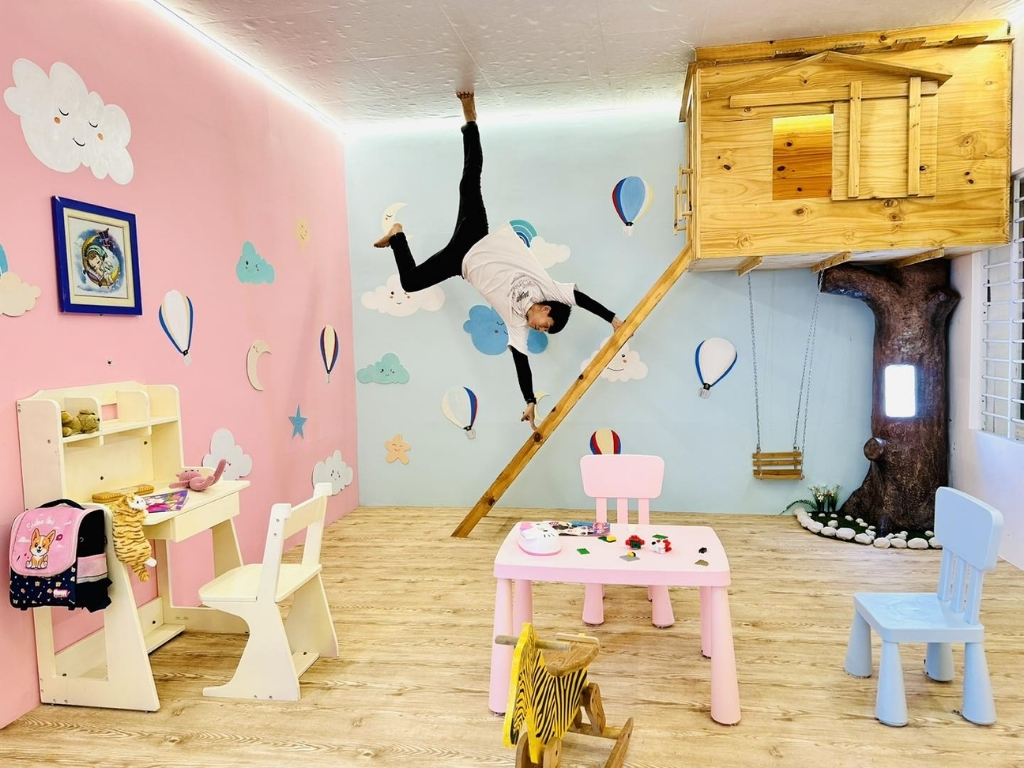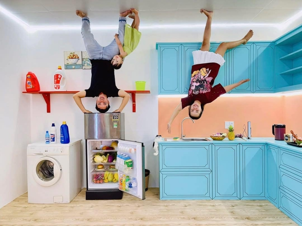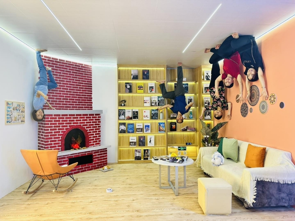 Nhà Úp Ngược gồm 7 phòng studio được thiết kế với nội thất lạ mắt. Mỗi phòng được trang trí theo kiểu ngược, từ bàn ghế, giường ngủ, đến các đồ trang trí, tất cả đều được treo trên trần nhà, tạo cảm giác như bạn đang bước đi trên trần nhà. Không gian này đặc biệt phù hợp cho những bức ảnh “lầy lội”, hài hước và độc đáo, khiến mọi du khách không thể rời mắt. Đây cũng chính là lý do mà nơi này trở thành điểm check-in nổi bật của giới trẻ.