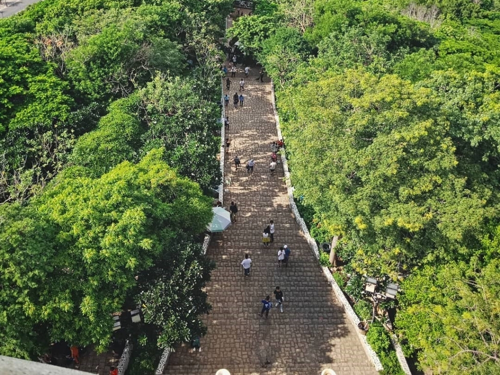 Từ đây, bạn cần leo bộ khoảng 793 bậc tam cấp để lên tới đỉnh núi. Đường leo tuy dài và có đoạn dốc, nhưng hai bên đường được bố trí nhiều ghế đá, bóng mát cây xanh giúp bạn dễ dàng nghỉ ngơi. Anh Quốc Limousine khuyến nghị bạn nên mang theo nước uống, mặc đồ thoáng mát, giày thể thao để đảm bảo an toàn và thoải mái khi leo núi.