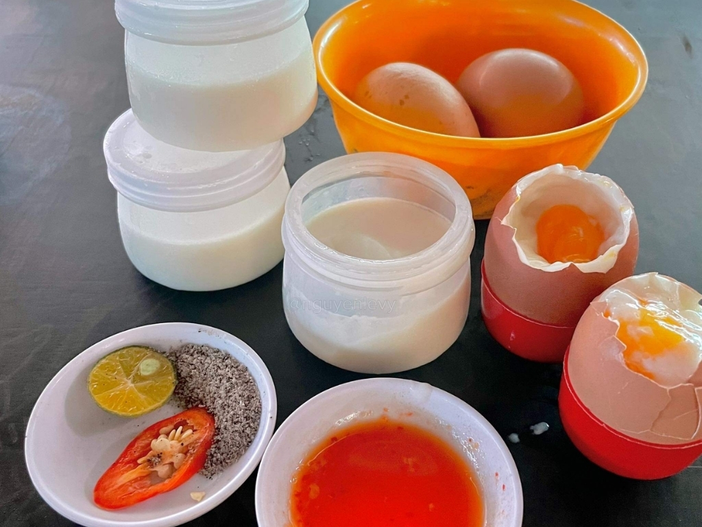 - Trứng gà lòng đào luộc theo công thức riêng giữ lòng sánh mịn, ăn kèm nước chấm gia truyền tạo hương vị khó quên.